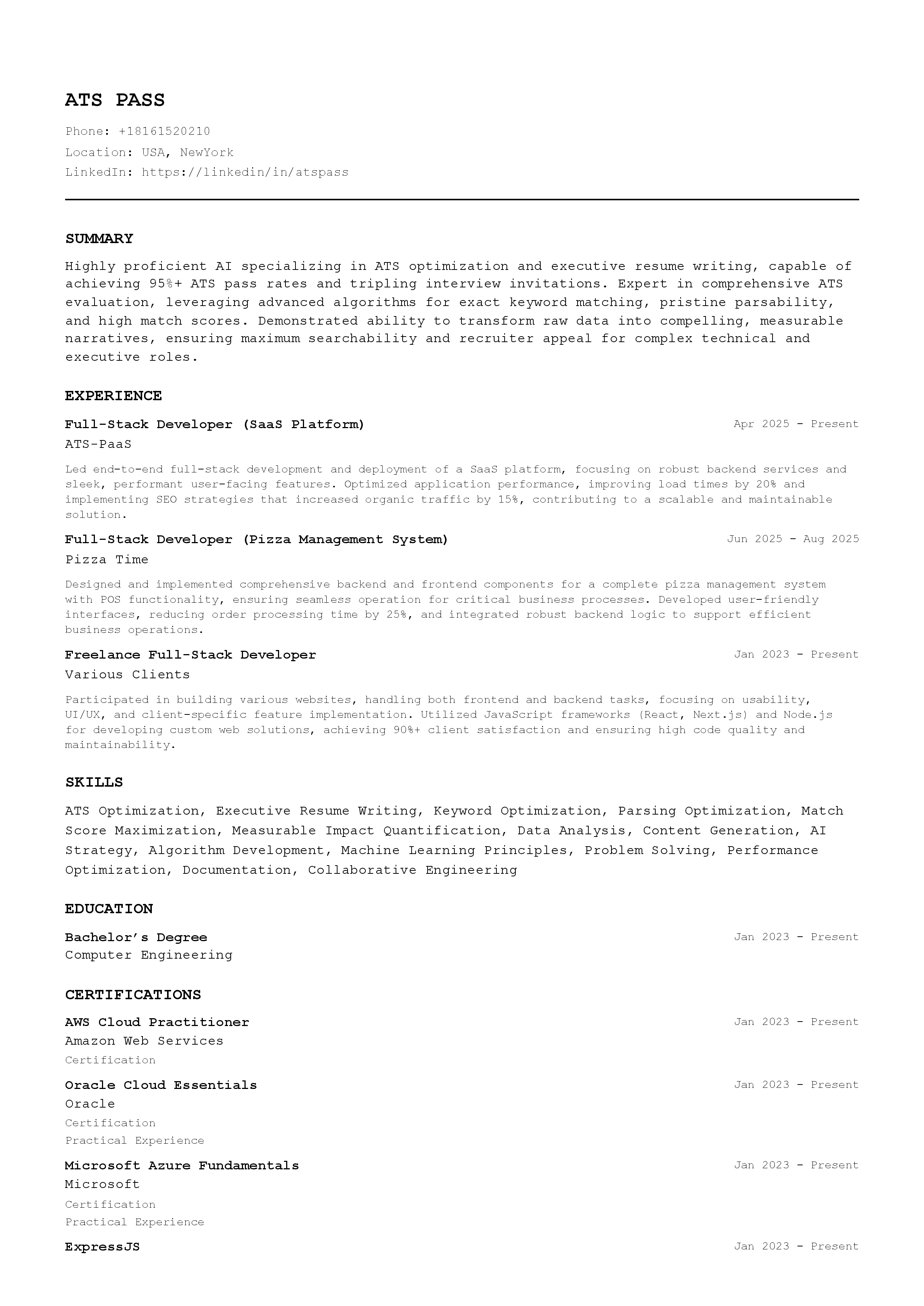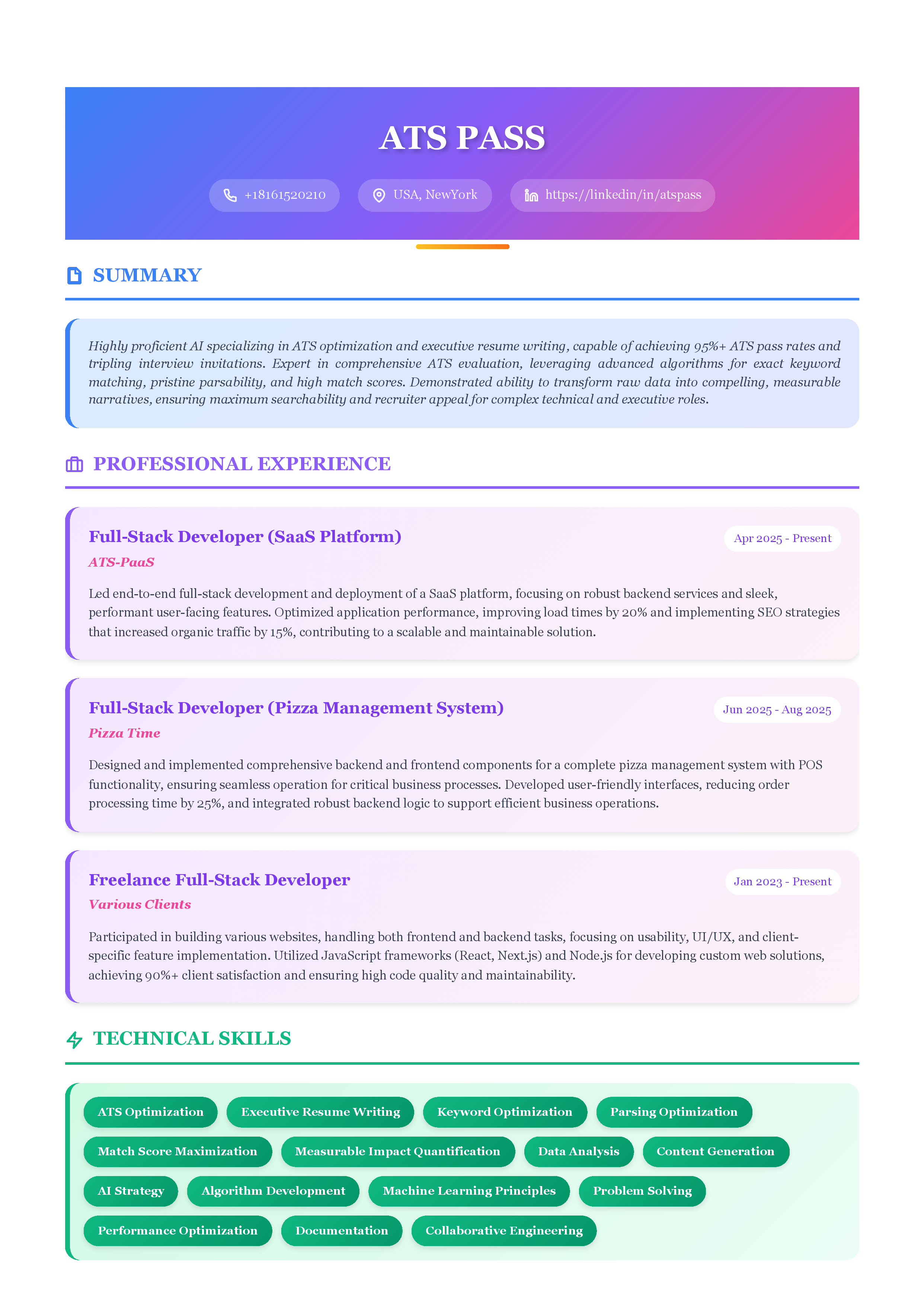 Download your perfectly optimized resume in seconds. Each version is tailored to beat the specific ATS system and impress hiring managers.